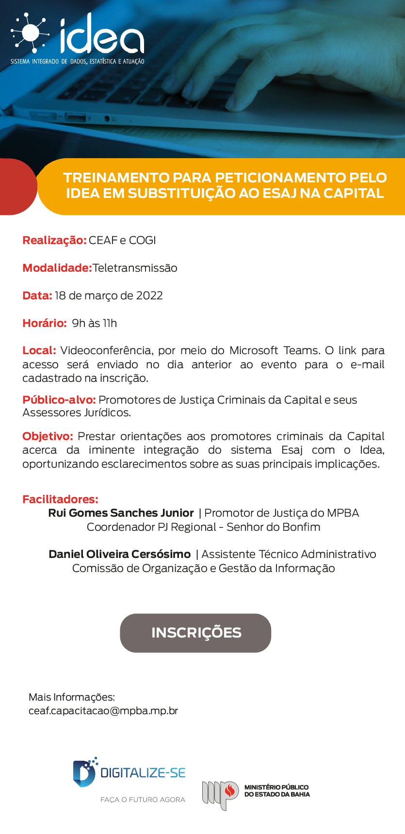 Resumo: Treinamento realizado na modalidade de teletransmissão, através de conferência, por meio do Microsoft Teams. O link para acesso foi enviado no dia anterior ao evento para o e-mail cadastrado na inscrição. Tendo como público-alvo Promotores de Justiça Criminais da Capital e seus Assessores Jurídicos. Objetivo é prestar orientações aos promotores criminais da Capital acerca da iminente integração do sistema ESAJ com o IDEA, oportunizando esclarecimentos sobre as suas principais implicações. Facilitadores: Rui Gomes Sanches Junior, Promotor de Justiça do MPBA, Coordenador PJ Regional - Senhor do Bonfim; Daniel Oliveira Cersósimo, Assistente Técnico Administrativo, Comissão de Organização e Gestão de Informação.